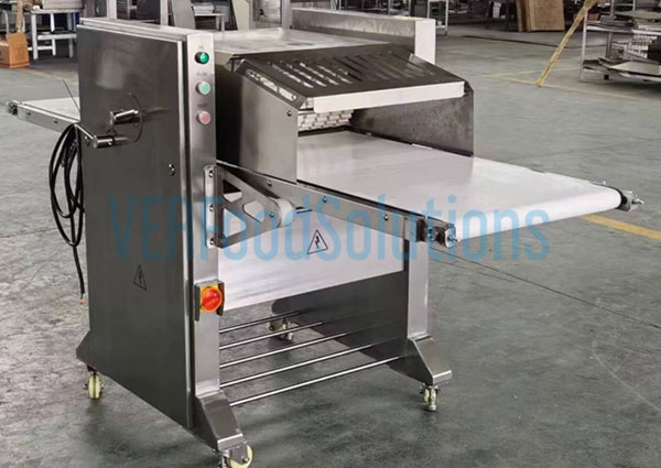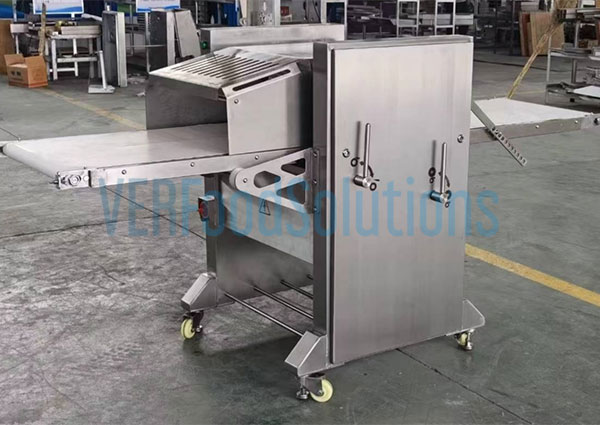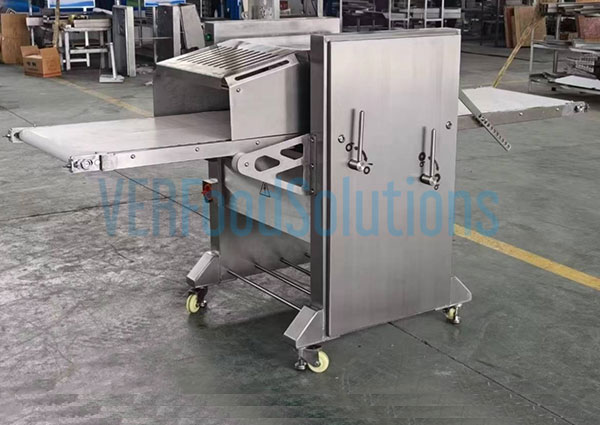 Our pork skin peeling machine is equipped with a widened feed inlet, available in four sizes: 300mm, 435mm, 500mm, and 620mm, to accommodate various pork cuts and processing requirements. Made from high-quality 304 food-grade stainless steel, the feed inlet offers excellent corrosion resistance, meets strict food hygiene standards, and is easy to clean, ensuring a safe and sanitary production environment. The wide inlet allows meat pieces to enter smoothly, preventing slippage and uneven feeding, which helps reduce meat loss. The thoughtfully arranged components—including pressure rollers, drive rollers, cutter holders, and feed racks—ensure stable and consistent entry of meat into the processing area, minimizing blockages and maintaining high processing efficiency. Additionally, the design facilitates easy cleaning, allowing residual meat to be quickly removed from the feed rollers, thereby improving maintenance efficiency and extending the machine’s operational lifespan.