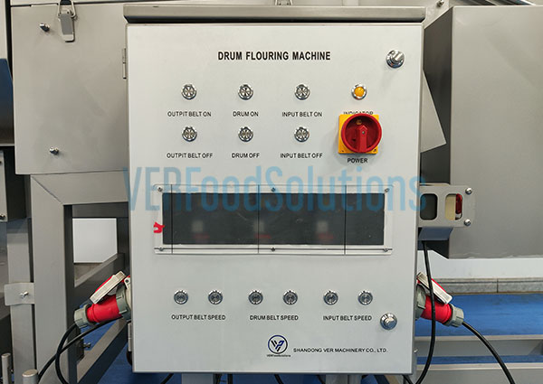 Our drum flouring machine is equipped with a user-friendly English control panel designed for ease of operation. The panel allows operators to adjust key parameters such as the input section speed, output section speed, and drum rotation speed, providing precise control over the flouring process. It also features straightforward controls to enable or disable the input section, output section, and inner drum section as needed. For safety and quick response, the control panel includes an emergency stop indicator and a dedicated emergency stop button. Additionally, an emergency stop button is conveniently located on the side of the panel, ensuring operators can quickly halt the machine if necessary, thereby enhancing safety and preventing accidental activation in unforeseen situations.