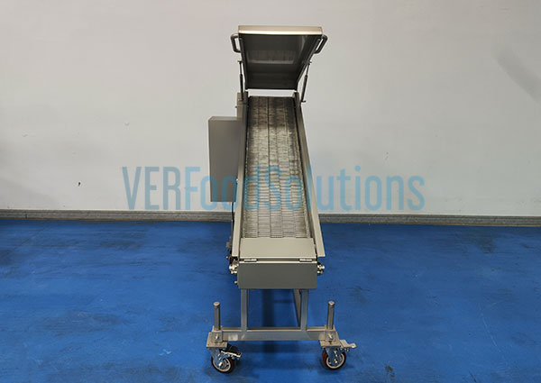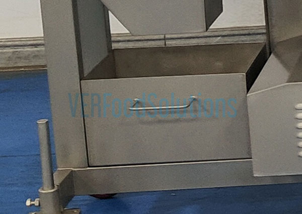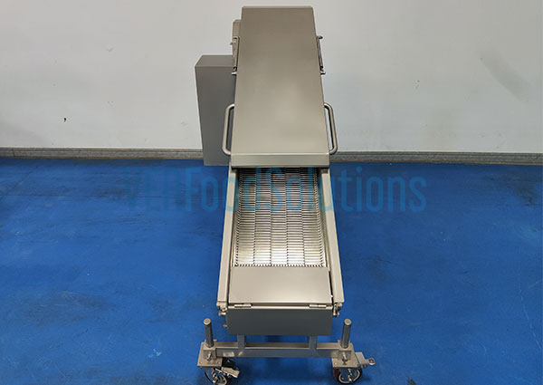 This section is equipped with a side viewing window for easy observation of the process and includes a baffle and handle for adjusting the flour thickness. Raising the baffle increases the amount of flour falling, creating a thicker pre-sprinkled flour coating; lowering the baffle reduces the flour flow, creating a thinner coating.This adjustable design provides flexibility to maintain optimal flour coating quality and flavor.