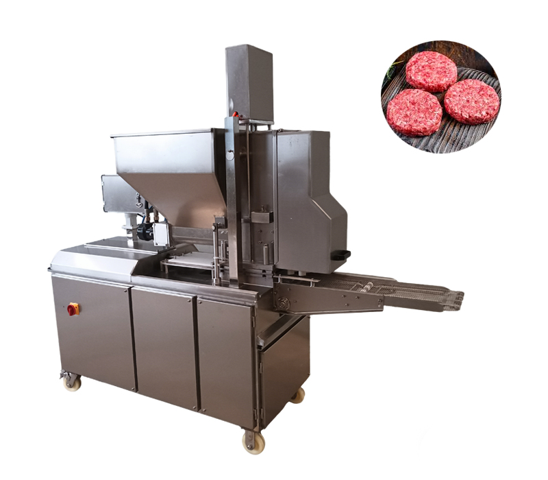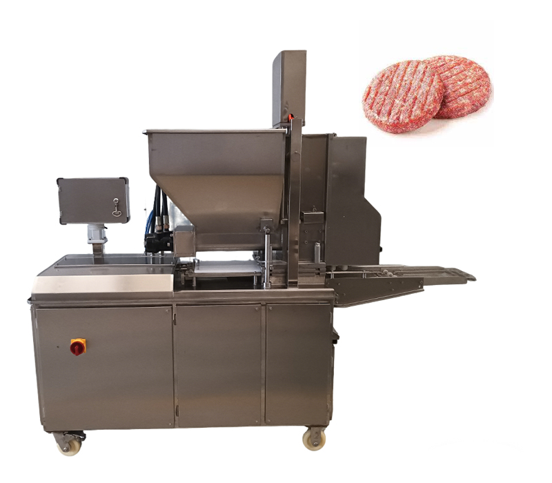 This automatic hamburger forming machine could be incorporated with a battering machine, flouring machine, frying machine, instant freezer, steaming machine and packaging machine to form a fully automatic production line.