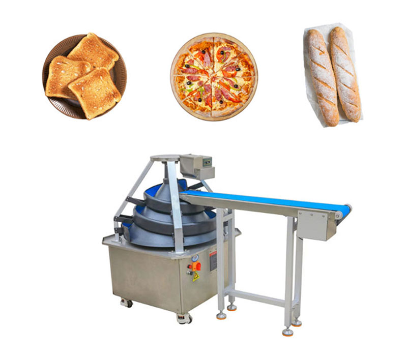 The continuous dough rounding machine is a high-efficiency device specially designed for large-scale baking production. It features precise and stable performance, ensuring consistent and high-quality dough processing across various dough types. Capable of handling both oil-containing and oil-free medium-soft doughs, the machine excels with soft, fluffy dinner roll doughs as well as firmer handmade bread doughs, even highly sticky varieties with moisture content between 45% and 70%. Its innovative spiral track and conical contact components mimic manual rounding, automatically shaping each dough piece with uniform weight and roundness. Constructed from durable structural steel and food-grade 304 stainless steel, the machine’s surface can be coated with nano-ceramic or Teflon to enhance wear resistance, anti-sticking properties, and corrosion resistance. All dough-contact parts are removable, washable, and meet high food hygiene standards, supporting continuous operation for up to 12 hours with minimal maintenance.