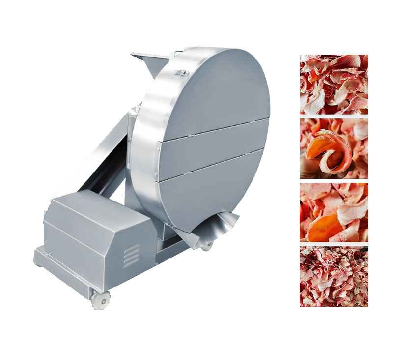 Designed for versatility and efficiency, this frozen meat flaker machine is suitable for slicing various frozen meats such as pork, beef, mutton, fish, and chicken, directly from frozen blocks or trays. Its robust construction includes a 4kW motor paired with a high-torque reducer, ensuring powerful and consistent slicing performance. The blades are made from imported special steel, forged into a seamless, reinforced disc that withstands heavy use. Safety guards at the inlet and outlet protect operators during operation. Widely used in sausage, meatball, and hot dog production lines, this frozen meat flaker machine saves time by eliminating thawing, while enhancing productivity through its high-speed, adjustable slicing capabilities and durable construction. Customization options are available to meet specific processing requirements.