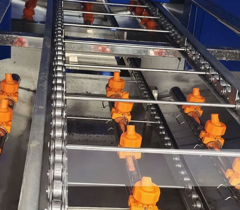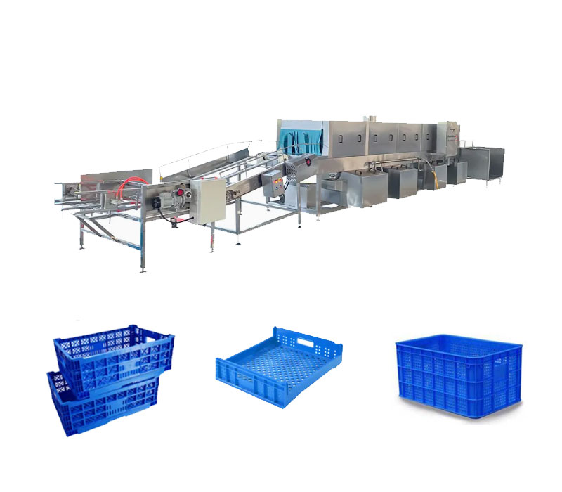 Our crate washing machine typically have four built-in processes: hot alkaline water, hot water, cold water, and air drying. These processes can quickly and efficiently clean large quantities of baskets stained with dirt, blood, oil, and other stains. They also air-dry the baskets immediately after cleaning, ensuring a clean and hygienic environment while saving manpower.